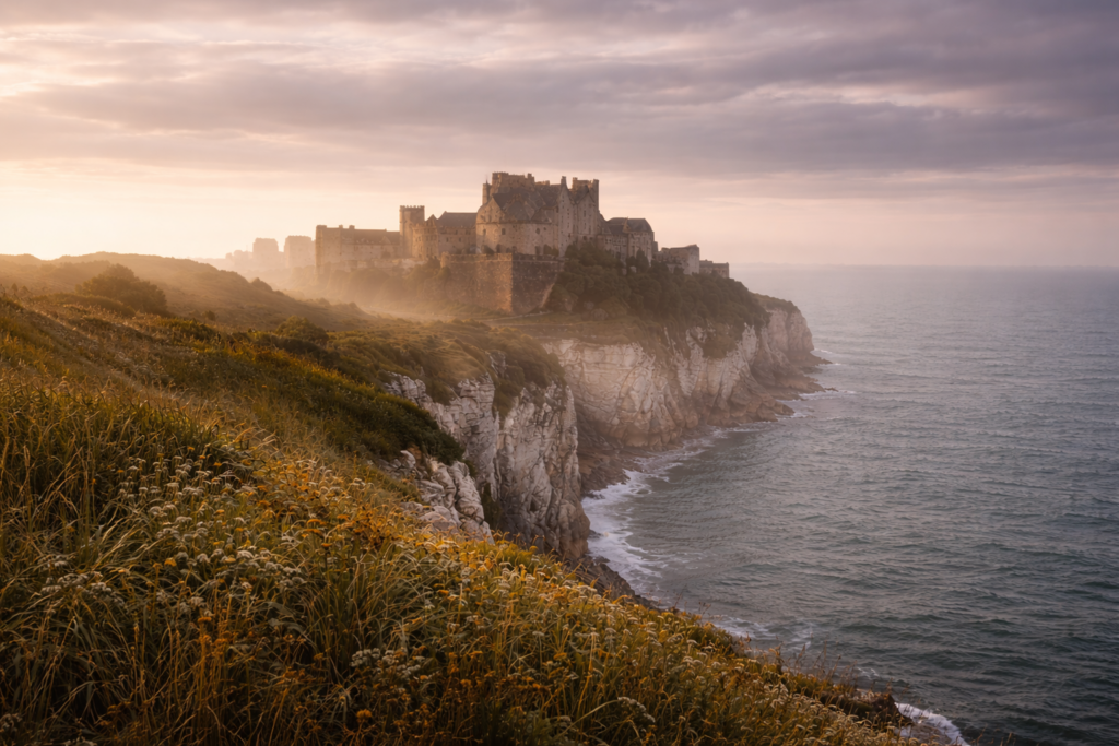 Dover Castle – Spot Guide Englands Festung über den weißen Klippen Route Fourteen`n Eight – England Edition Originalbild folgt – aktuell Illustration (KI-generiert) Short – Facts Ort: Dover, Kent Öffnungszeiten: vorher checken Zeit vor Ort: 2–4 Stunden Vibe: historisch, windig,
